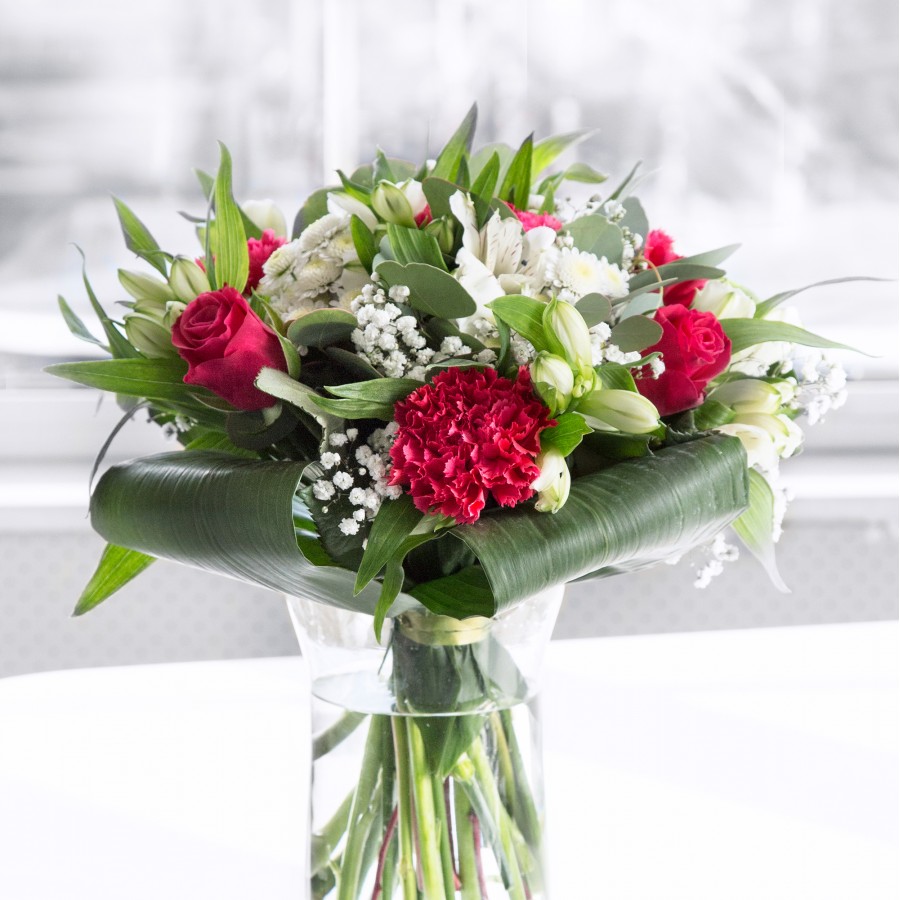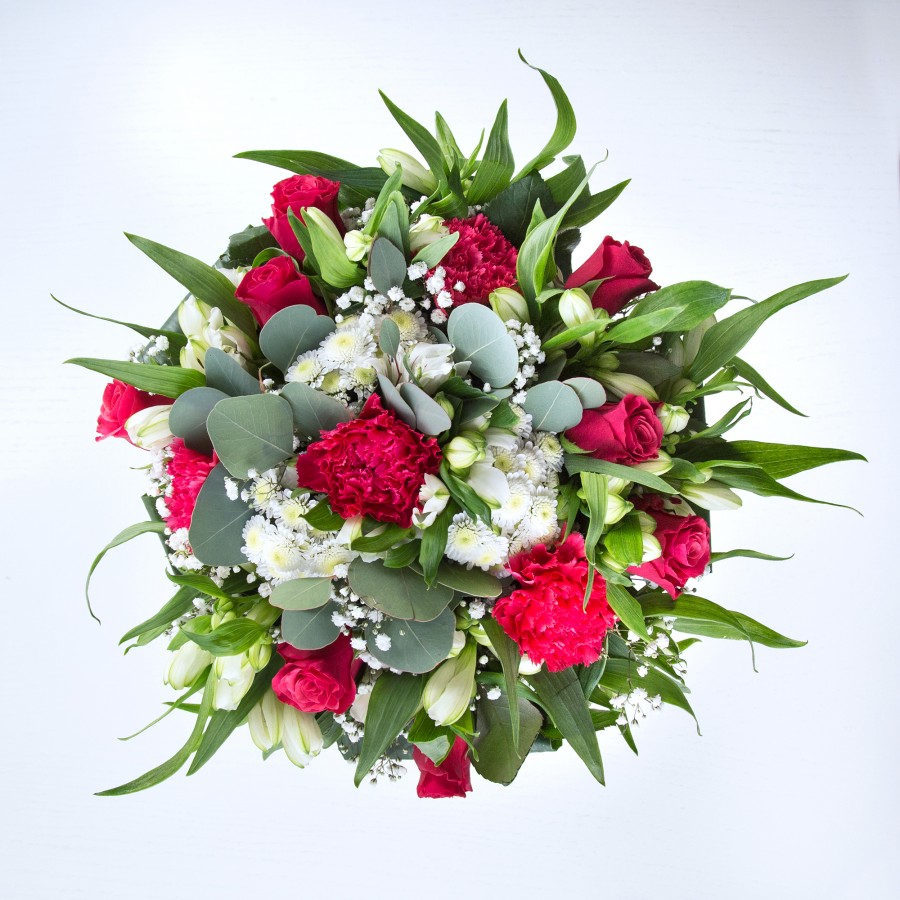 Embrace the opulence of our Red & White Flower Arrangement, a bouquet that blends luxurious red roses with pristine white chrysanthemums and gypsophila. This stunning arrangement is further enriched with carnations and white alstroemeria, all elegantly set against aspidistra leaves.